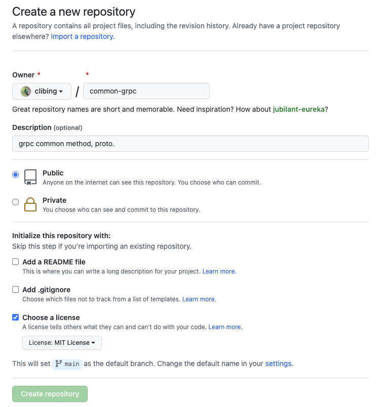 在GitHub上创建一个项目名字为common-grpc,协议选择MIT