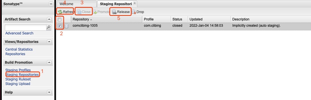 - 进入个人中心的左侧导航栏的Staging Repositories or https://s01.oss.sonatype.org/#welcome,这时会展示列表, 一般最后一个为刚刚发布的jar,此时的构件状态为 Open