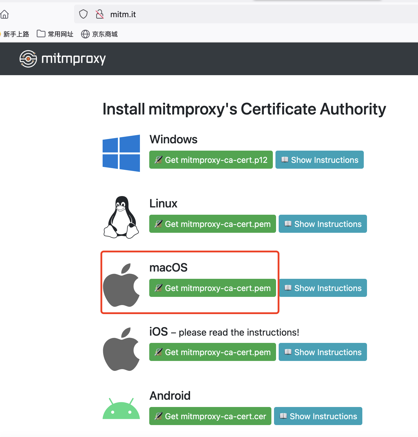 - 打开浏览器输入 http://mitm.it/选择对应的操作系统