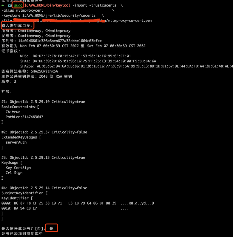 这是需要输入两次密码,第一个密码为sudo需要的密码,第二个密码为jdk的密码,默认为changeit,然后会提示确认信息,输入是