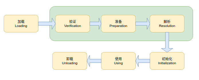 大致流程: 读取.class文件二进制文件–>验证与解析(格式 关键字 关键词 语法 引用 类型转化等等) –> 初始化 –> 使用 –> 卸载