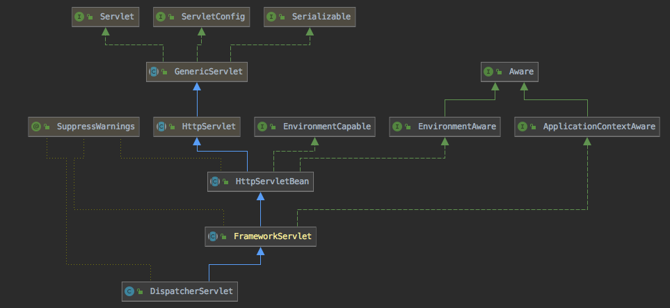- FrameworkServlet 继承了HttpServletBean并实现了ApplicationContextAware(设置上下文);